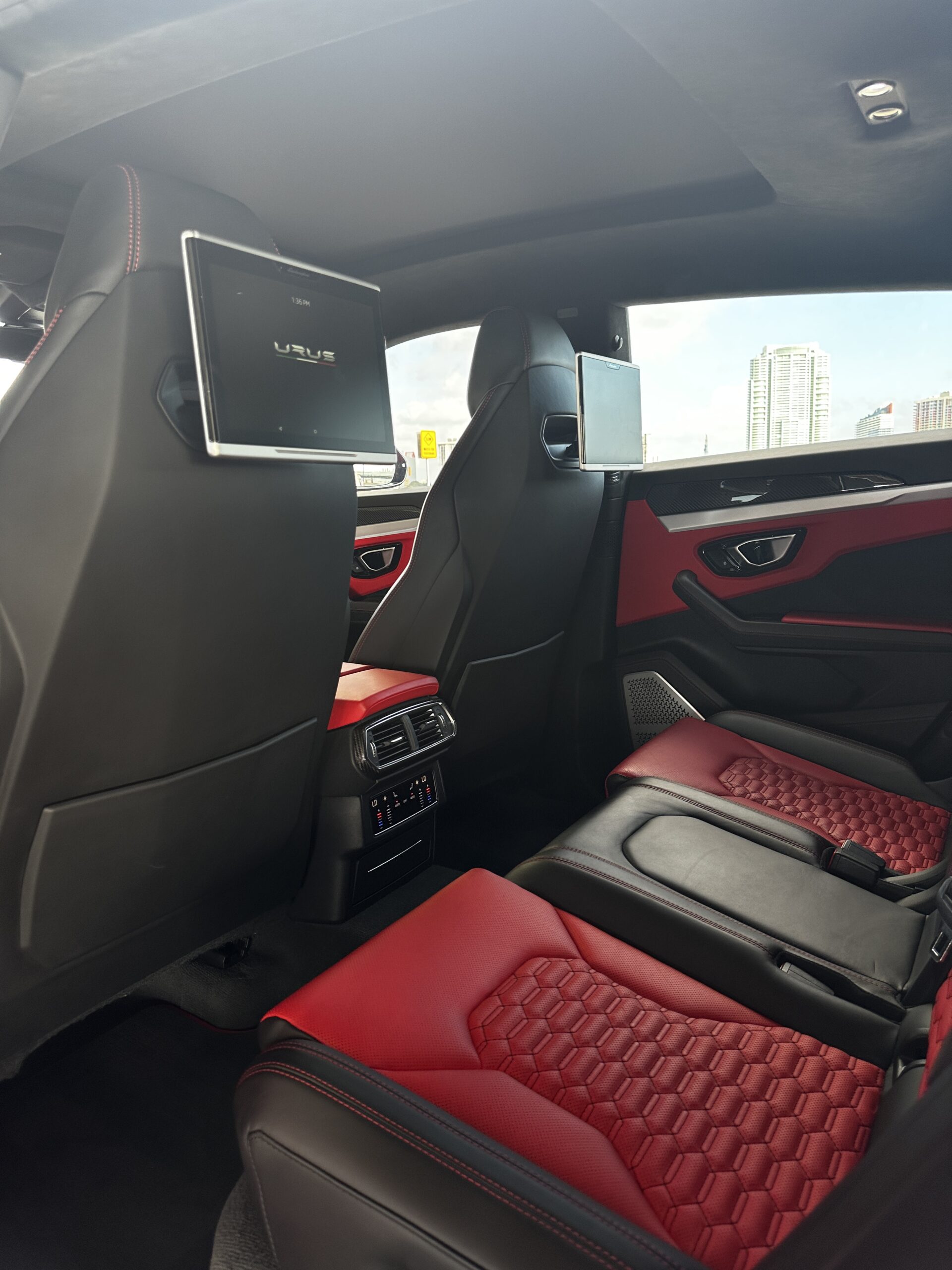 Experience the ultimate blend of speed, luxury, and style with this stunning Lamborghini Urus. With its striking black and red exterior and a sleek black-and-red leather interior, this powerhouse is designed to turn heads wherever you go. Feel the thrill of the road while enjoying top-of-the-line features like wireless charging, Wi-Fi, and an entertainment system in the rear to keep everyone entertained. The premium sound package will elevate your drive, while the sunroof lets you soak in Miami’s sunshine in style. Whether you’re cruising the city or hitting the open road, this Lamborghini Urus comfortably fits five people, making it the perfect choice for both adventure and luxury. Ready to make a statement in Miami? Your ultimate vacation begins here. Rent the Lamborghini Urus today and drive in unmatched style!